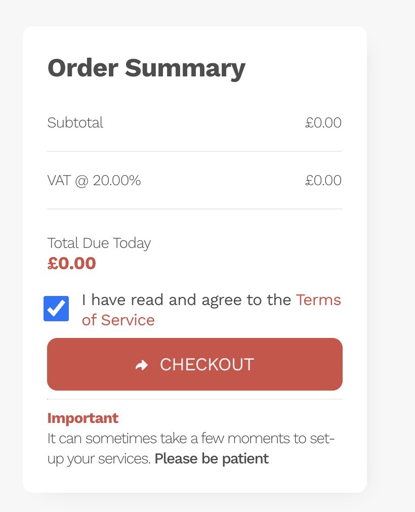 You will then be taken to the checkout. Even if the order total is £0, you still need to select a payment method. After reviewing and accepting our Terms and Conditions, click the Checkout button to provision your slot.