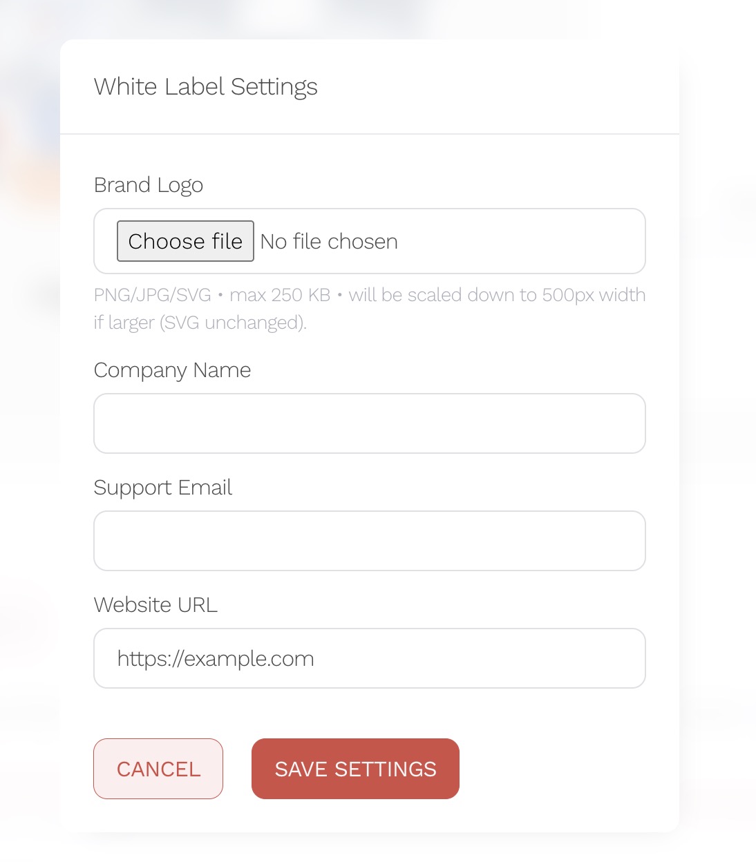 Complete the fields with your company details (such as company name, support email, website URL) and upload your logo.