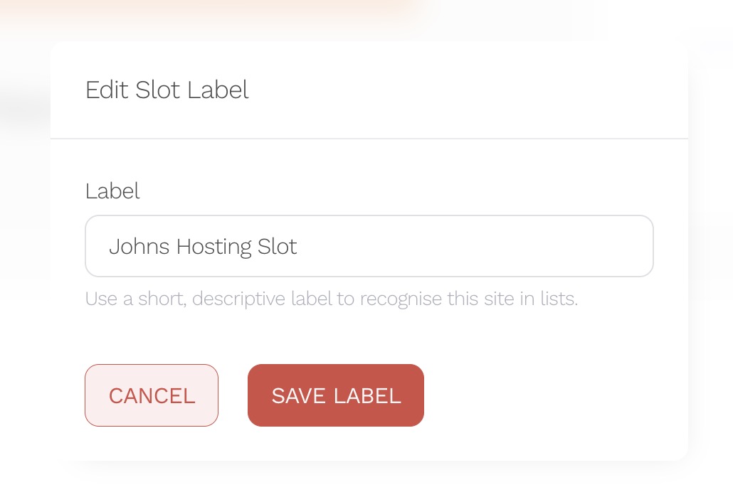 The slot label is a friendly name that you can assign to a hosting slot. It helps you remember what the slot is for or which client it belongs to. This information is not visible to your clients and is only for your own reference.
